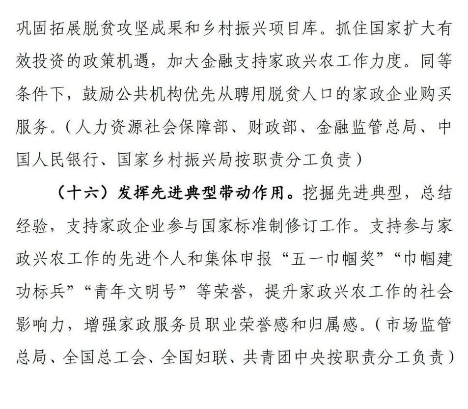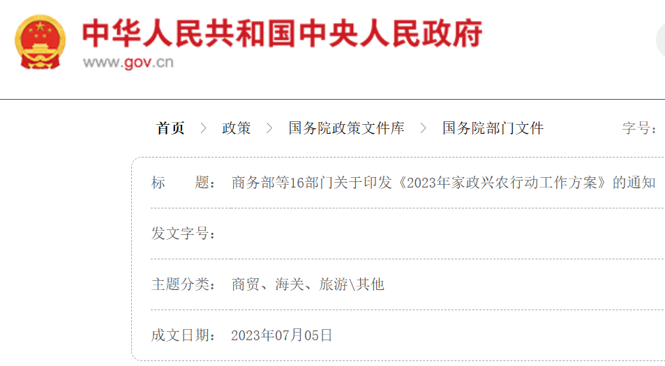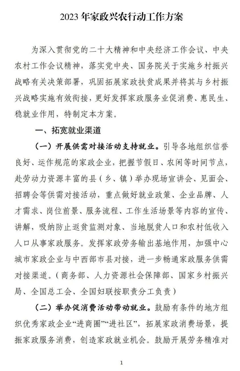 為深入貫徹黨的二十大精神和中央經濟工作會議、中央農村工作會議精神,落實黨中央、國務院關于實施鄉村振興戰略有關決策部署,鞏固拓展家政扶貧成果并將其與鄉村振興戰略實施有效銜接,更好發揮家政服務業促消費、惠民生、穩就業作用,商務部會同國家發展改革委等部門制定了《2023年家政興農行動工作方案》,現印發給你們,請結合實際抓好落實。